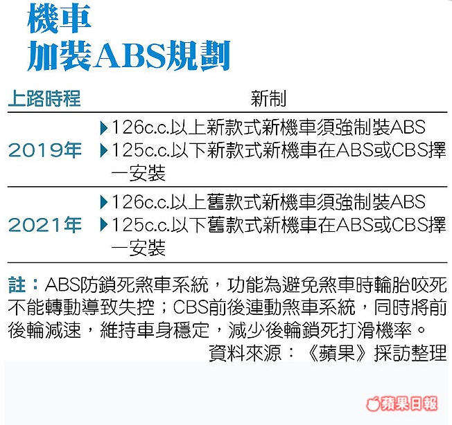 從後年元旦起,強制新款式的出廠新車須強制安裝ABS(防鎖死煞車系統)或CBS(前後連 動煞車系統),
